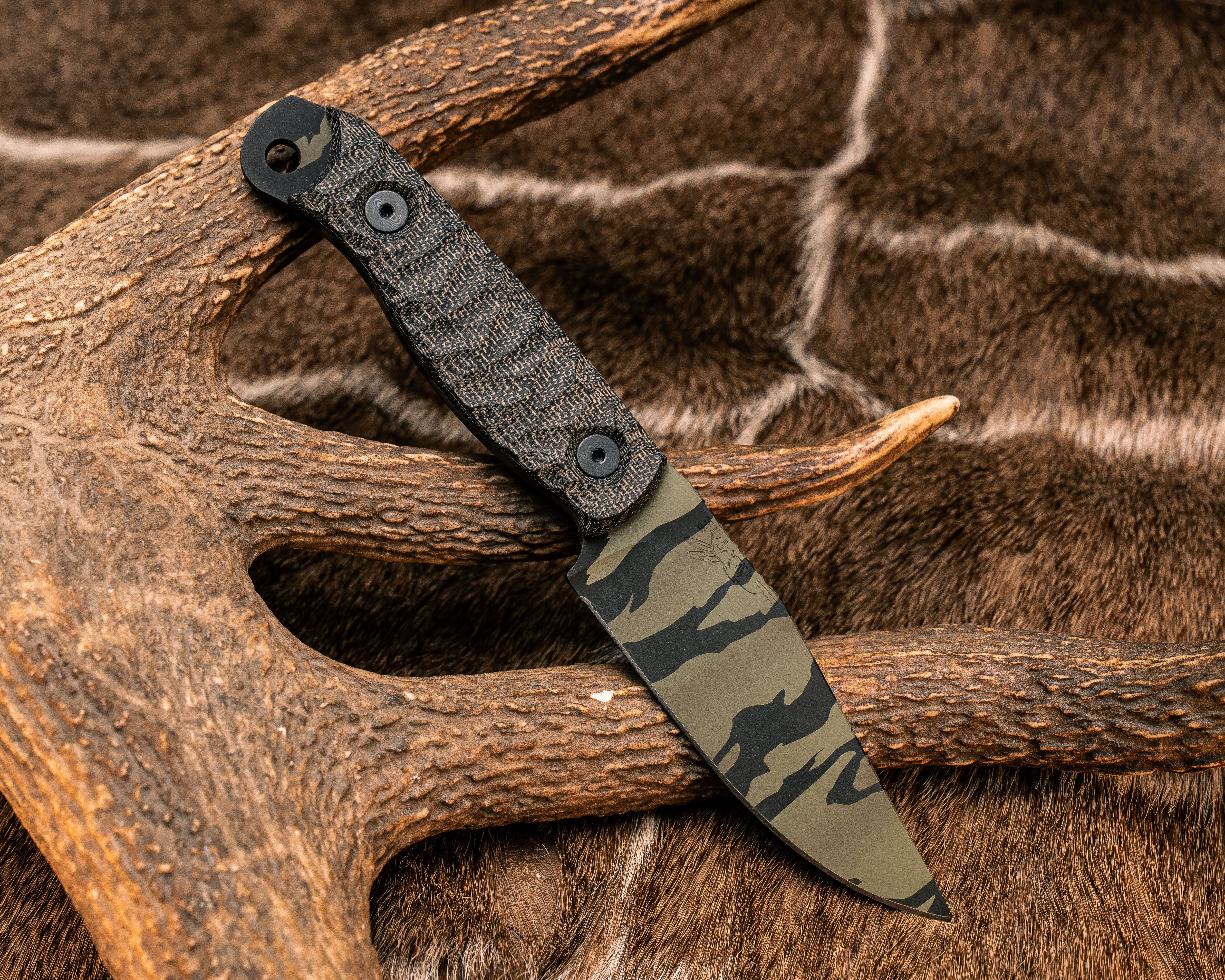 Next: Crow Scalper- Black Canvas Micarta, Tiger Stripe Cerakote, Allen Bolts, Textured Grip