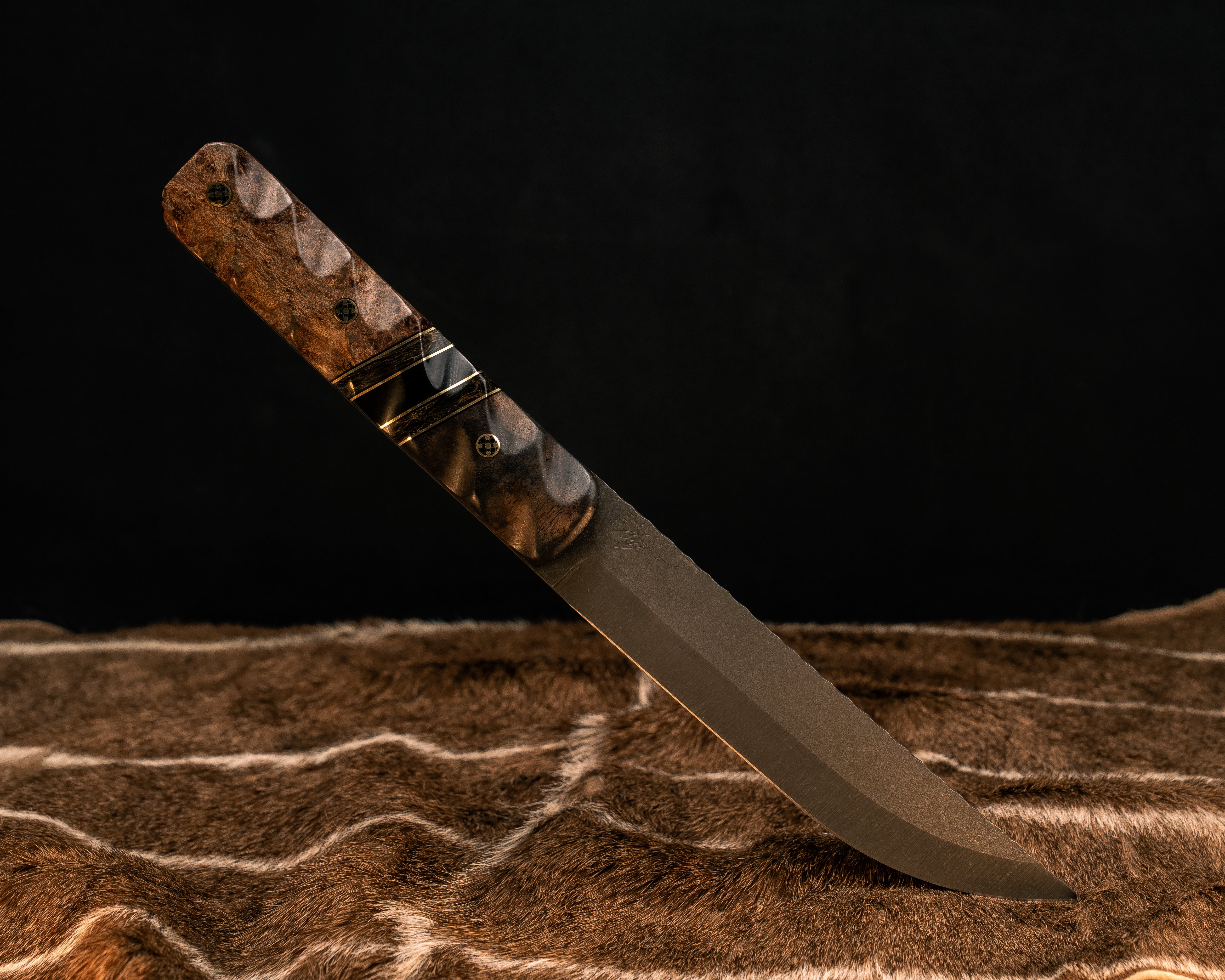 Next: Aikuchi- Black Walnut, Black G10 and Brass Pin Striping, Gold Dark Matter Carbon and Bison Horn Split, Black Forest Mango, Mosaic Pins, Textured Grip