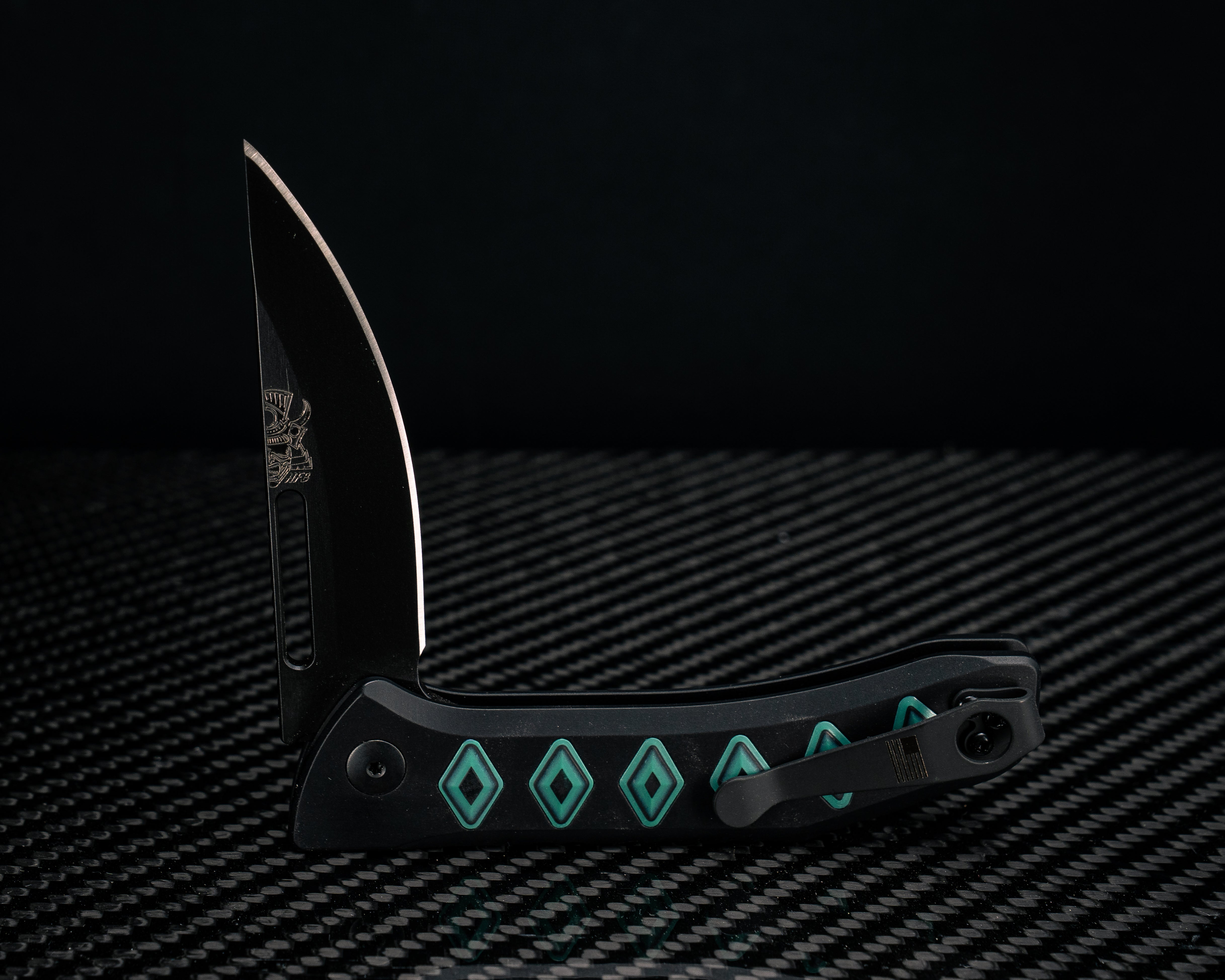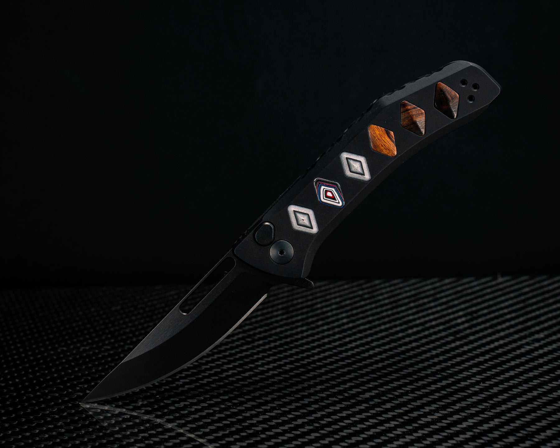 Custom Kwaiken Folder - White Camoquartz, Fordite and Desert Ironwood Inlay, Anodized Black Handle, Black Nitride Blade, Textured Grip, Deep Carry Pocket Clip