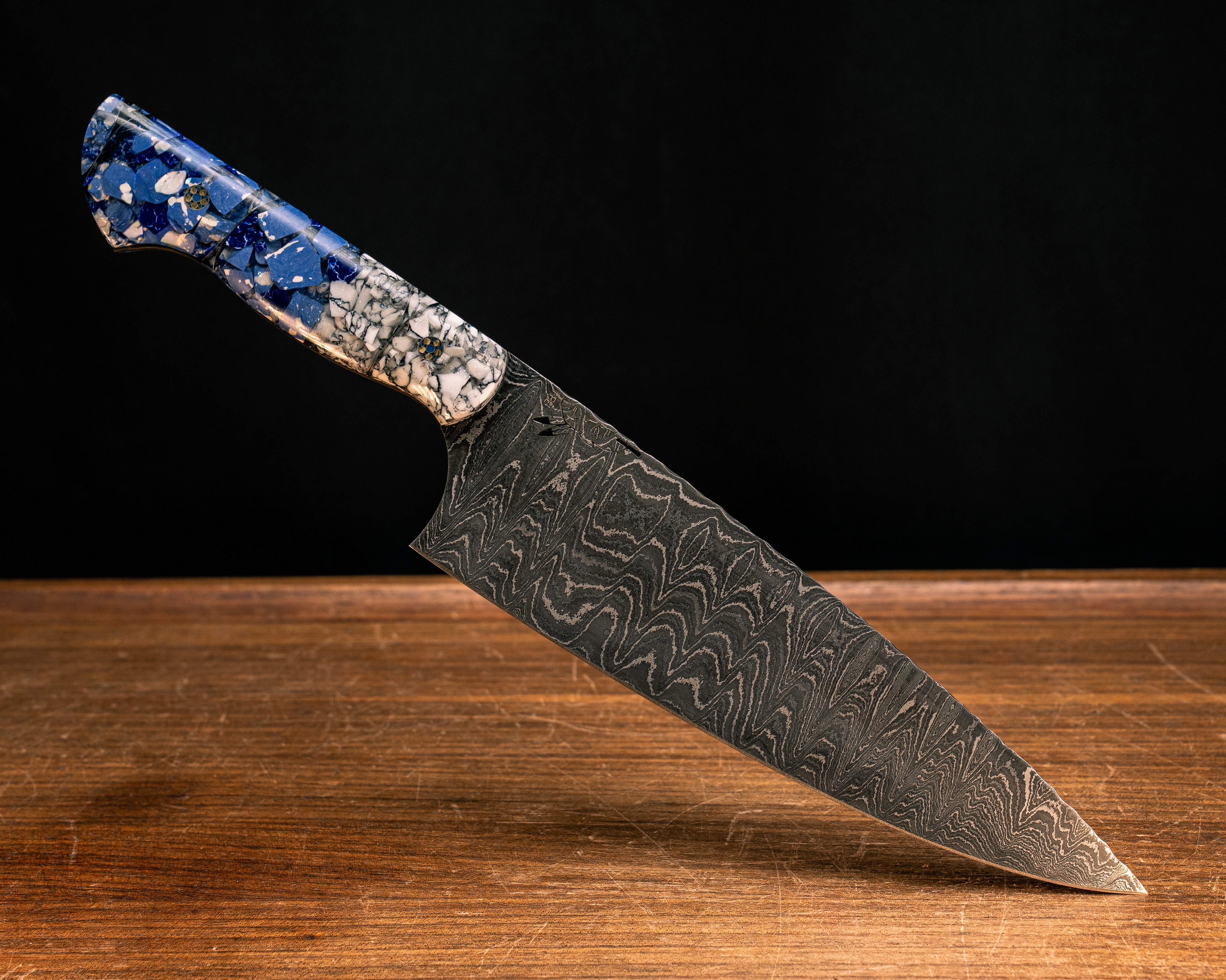 Next: Chef Blade- Baker Forge Ladder Stainless Damascus- Crushed White with Black Web Tru-stone, Crushed Sodalite Tru-stone and Blue and White Crushed Stone in Resin, Mosaic Pins, Smooth Grip