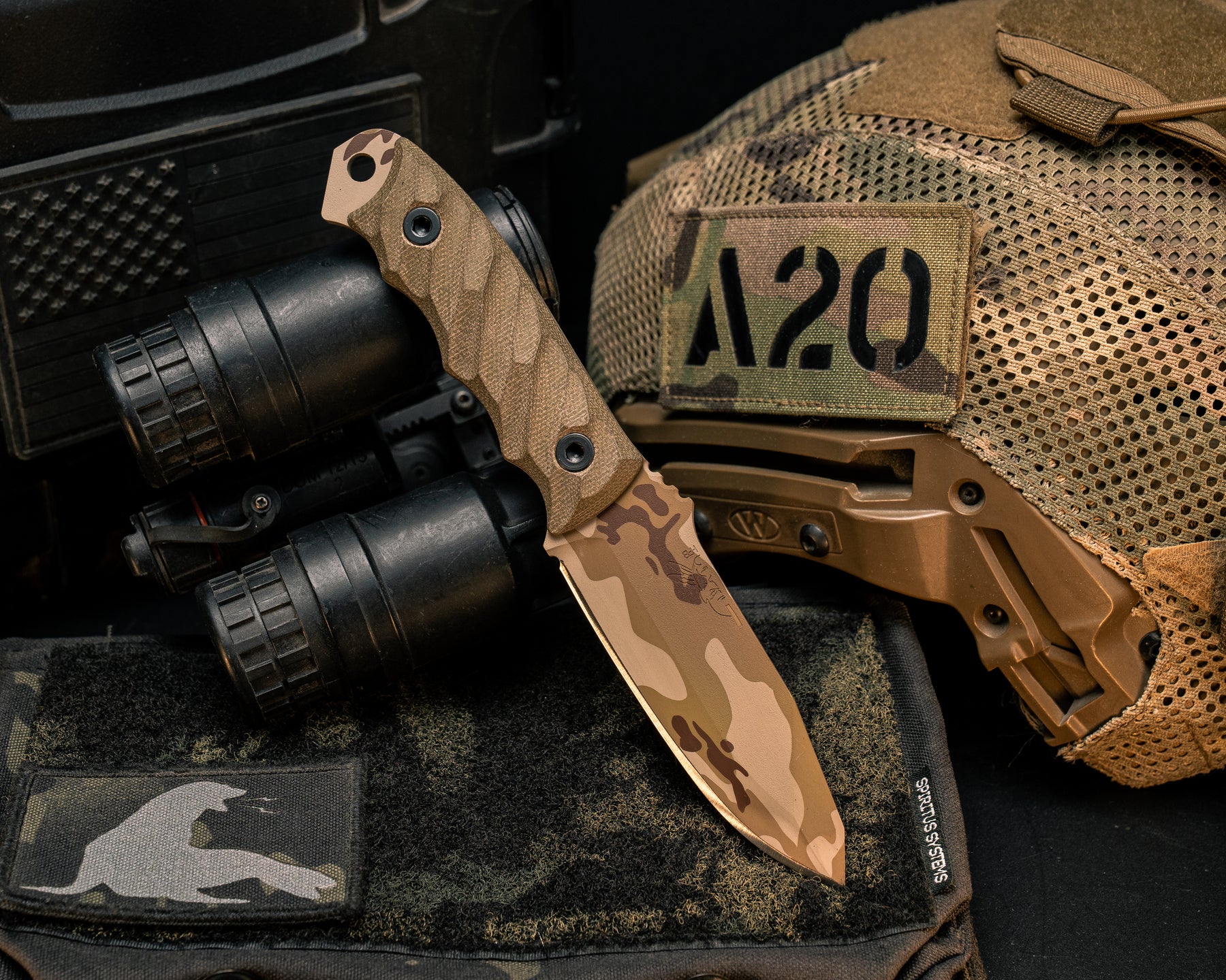 Next: Disaster Jr- Natural Canvas Micarta, Arid Multicam Cerakote, Allen Bolts, Textured Grip