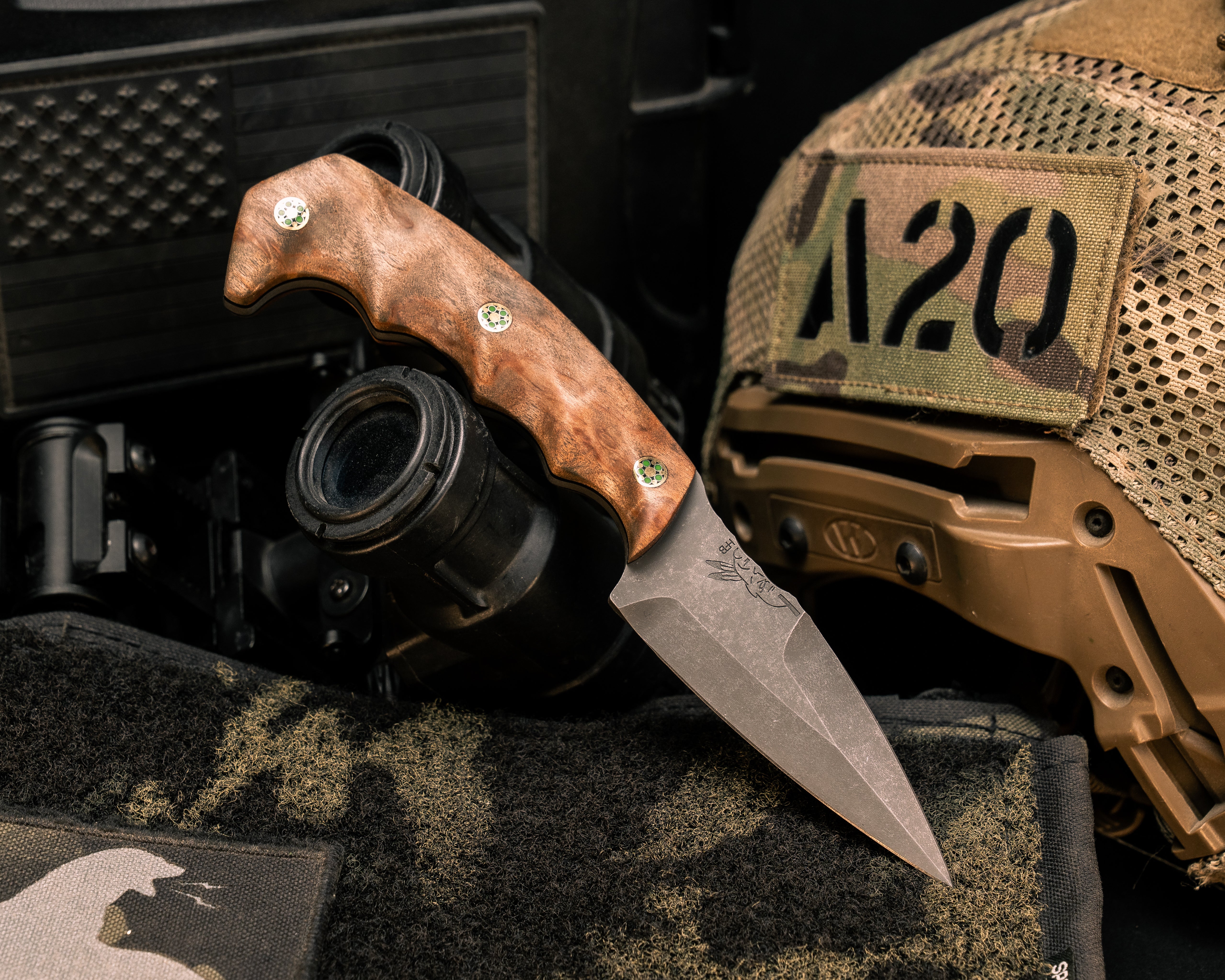 Next: Crow Jr- Dyed Maple, Carbon, Brass and White Resin Split, CO Elk Antler Over Fire Canvas Micarta and Black G10, Mosaic Pins, Brass Lanyard Pin, Textured Grip
