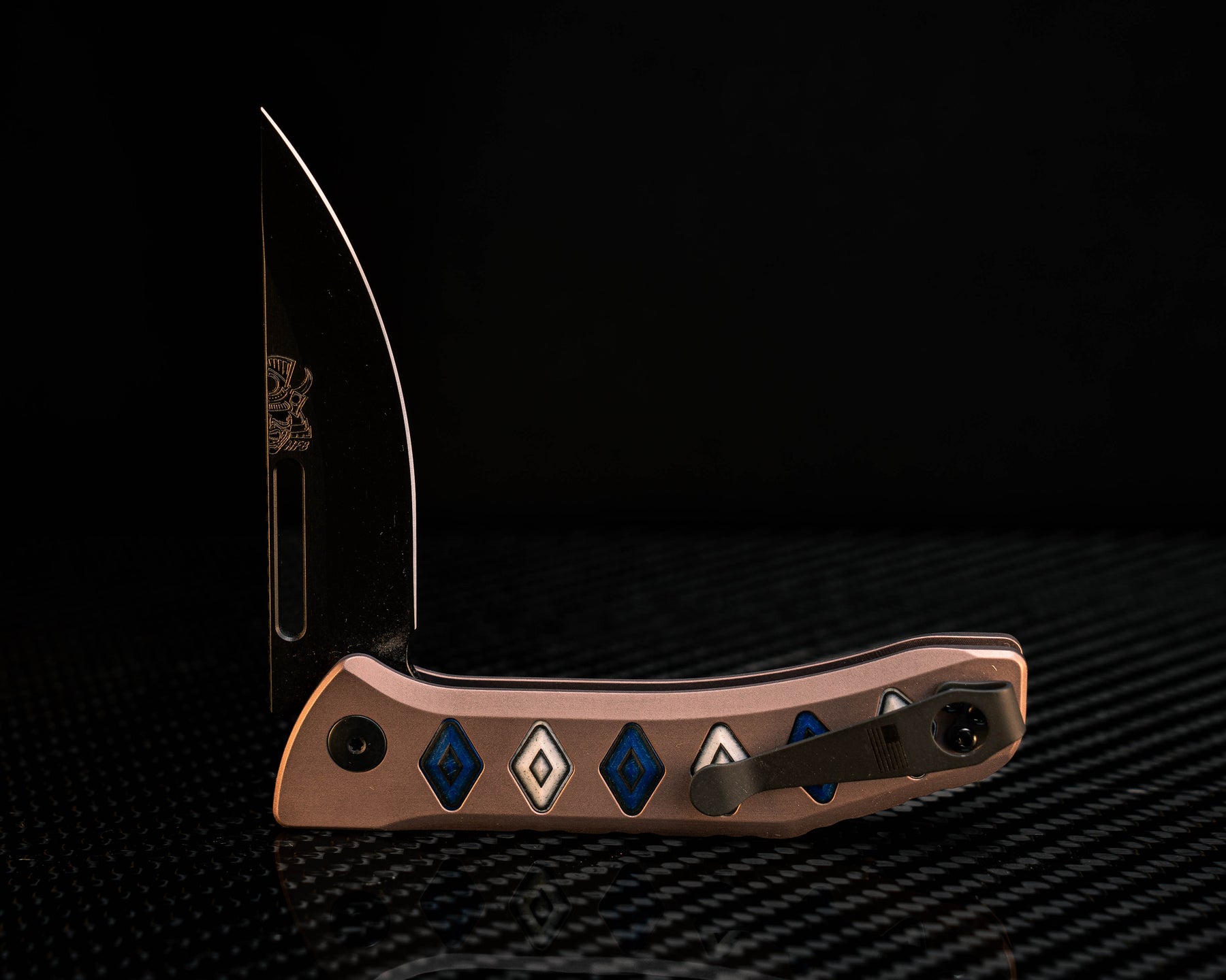 Custom Kwaiken Folder- Blue and White Camoquartz Inlay, Anodized Grey Handle, Black Nitride Blade, Textured Grip, Deep Carry Pocket Clip