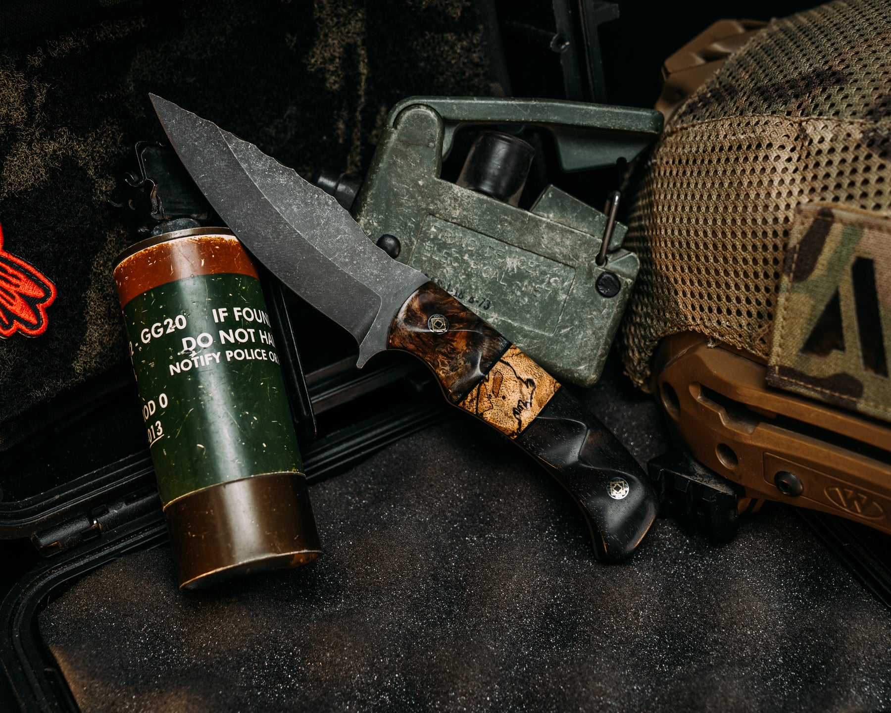 Ishi- Dyed Maple, Black G10 and Spalted Maple Split, African Blackwood, Mosaic Pins, Textured Grip