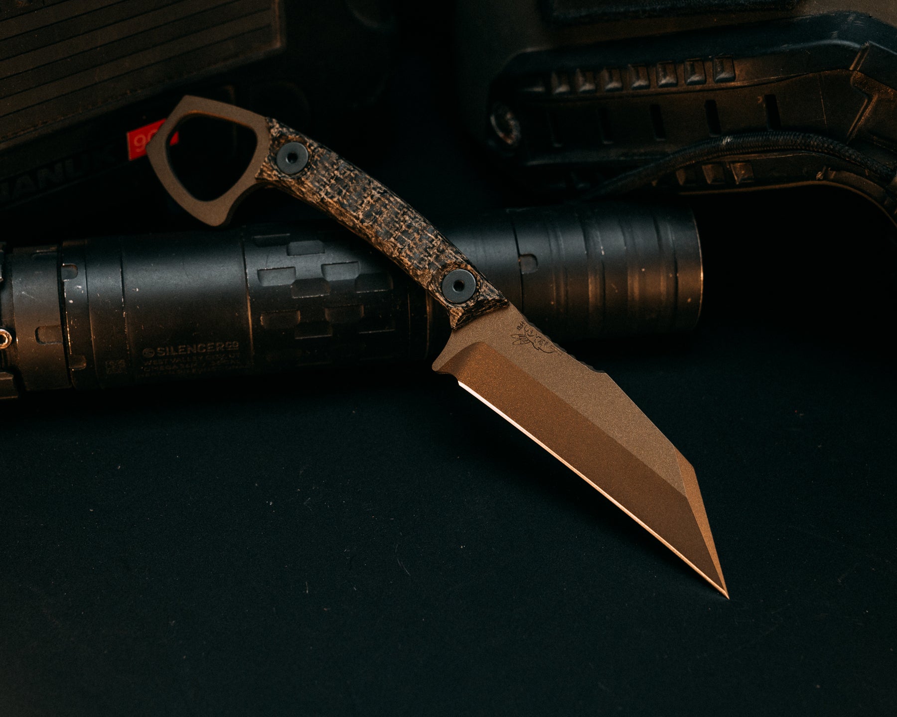 Blade designed by Special Operators for easy carry and easy access in plate carrier or in low vis situations, for pushing or stab and slash movements.