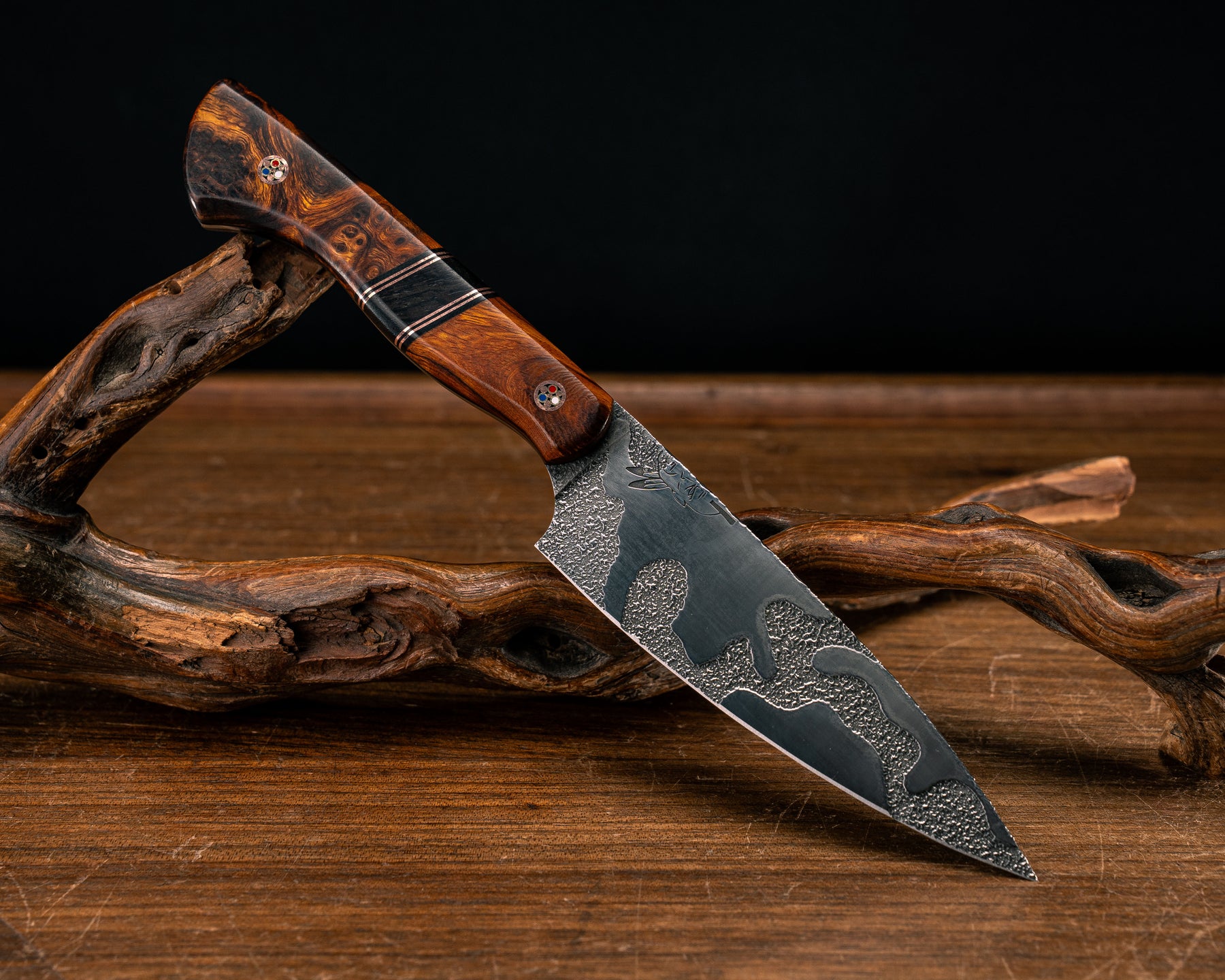 Steak Knife Set (4 piece)- Desert Ironwood, Black G10 and Copper Pin Striping, African Blackwood Split, Copper Patriot Mosaic Pins, Smooth Grip