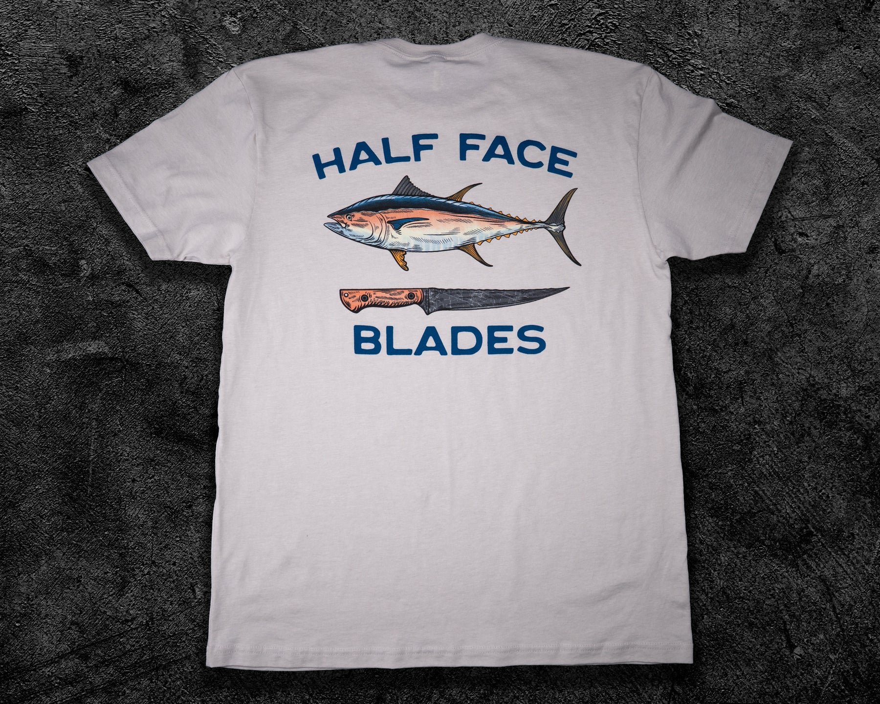 Half Face Blades Filet on Front, Tuna/Filet and Half Face Blades Graphic on Back.