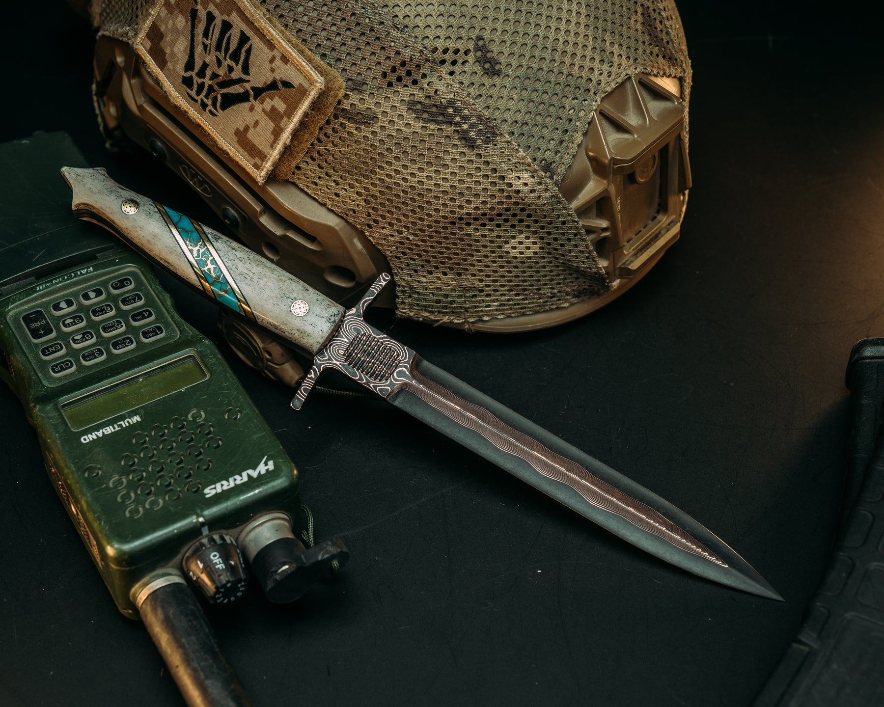 V-42 Dagger- Baker Forge Raindrop Pattern CopperMai- CO Elk, Black G10 and Brass Pin Striping, Turquoise with Gold Web Tru-stone Split, Mosaic Pins, Smooth Grip
